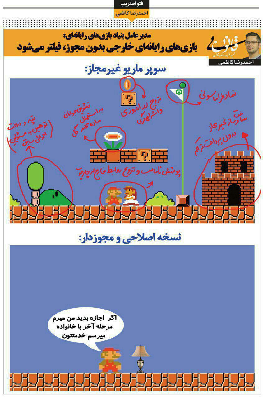 خبرفوری سرگرمی طنزوسرگرمی ۱۶ دی ۱۳۹۶ ۰۸:۵۸ کاریکاتور/ سوپر ماریو غیر مجاز «فیلتر بازیهای رایانهای بدون مجوز» عنوان کاریکاتور در طنز بی قانون است. کپی شد کدخبر: 251519 ت ت 35 طنز فیلتر بازی رایانه ای کپی شد با دوستان خود به اشتراک بگذارید: