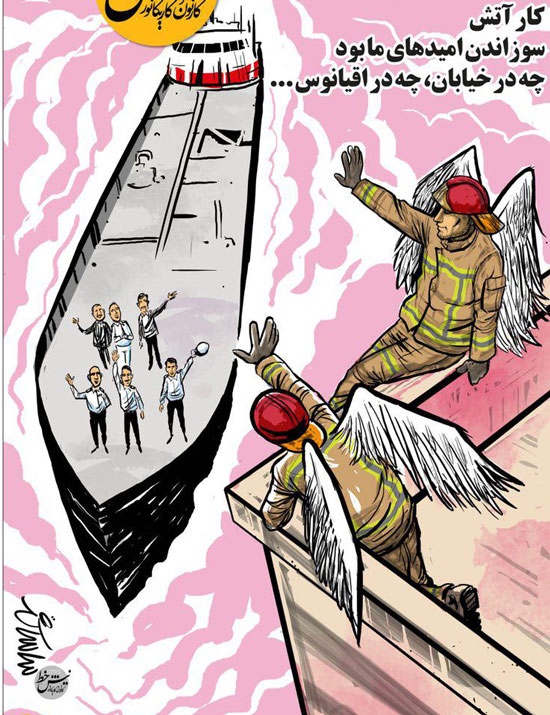 «کار آتش؛ سوزاندن امیدهای ما بود...چه در خیابان ...چه در اقیانوس...» شرح طرح ساسان خادم در نیشخط است.