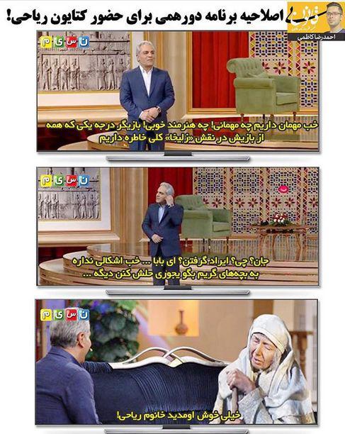 رفع مشکل پوشش و حجاب خانم ریاحی برای شرکت در برنامه دورهمی با تکنیک شبیه سازی زلیخا شوژه طنز در بی قانون شده است.