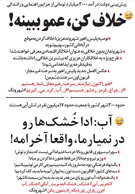 ستون طنز روزنامه شهروند به موضوع درآمد حاصل از تخلفات رانندگی و کم آبی شدید در کشور پرداخته است.