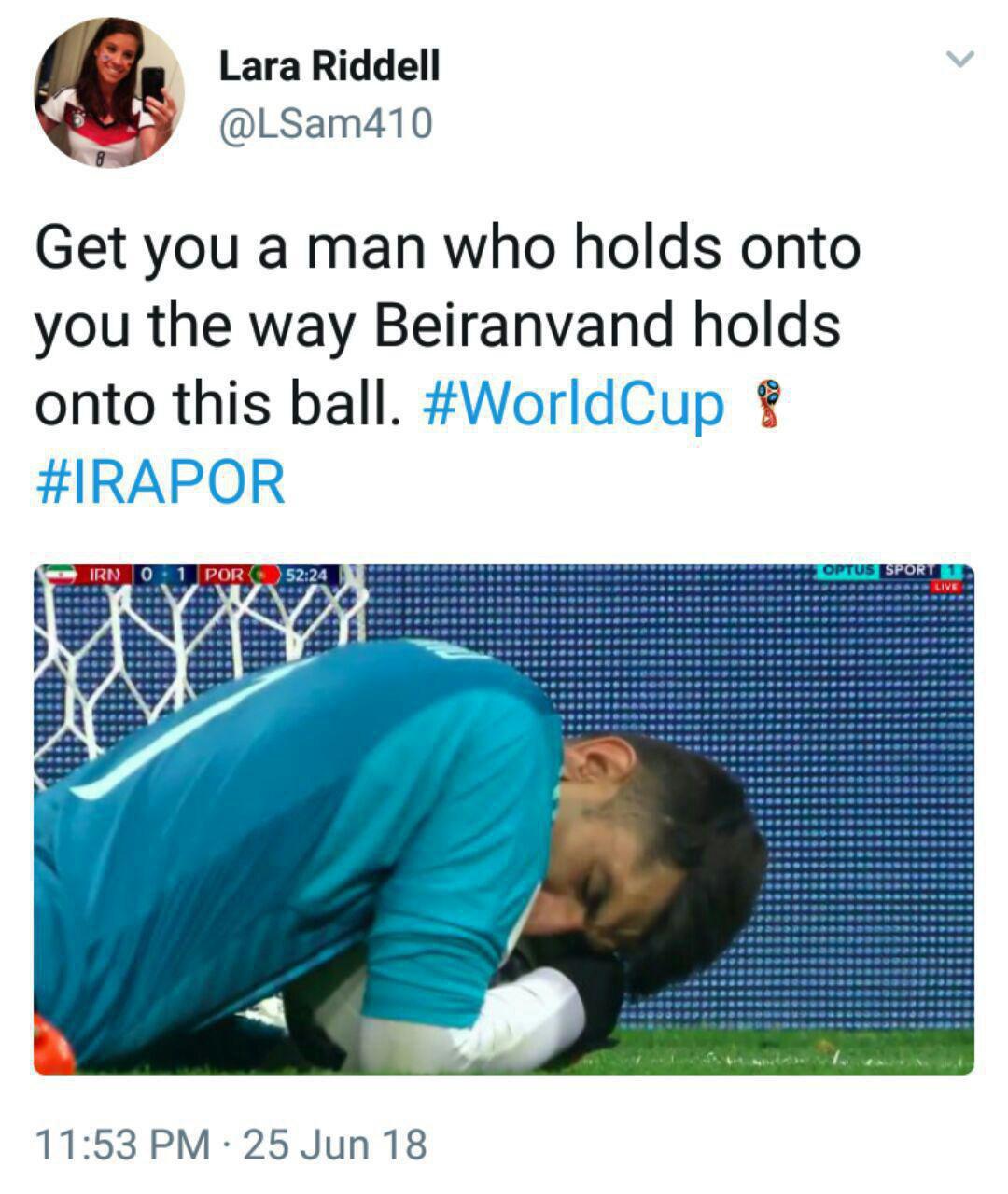 "مردی را پیدا کنید که اینطور که بیرانوند توپ را در آغوش گرفته بغلتان کند." البته نظر لطفته ولی بیرانوند غالبا بعد از این آغوشها، توپ(معشوق) را با دست تا نصف النهار مبدا پرتاب میکند! حالا هرجور راحتی!