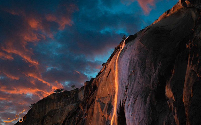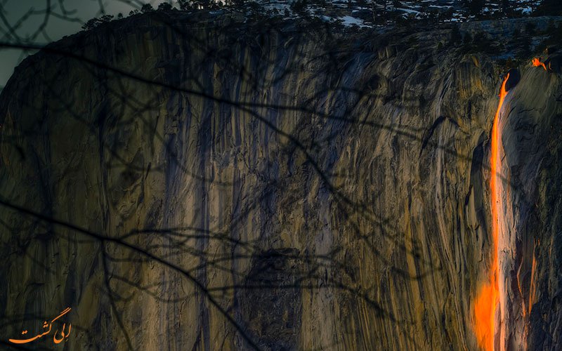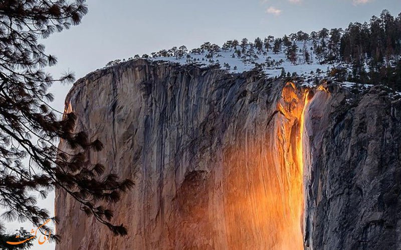 آبشار هورس تِیل که به معنی دم اسب است در پارک ملی یوسمیت در کالیفرنیا یک نمایش شگفت انگیز است. این آبشار فصلی در اوایل زمستان و اوایل بهار جریان دارد و در سمت شرق ال کپیتان به پایین می ریزد، و در پس زمینه آن یکی از برجسته ترین دیوارهای گرانیت در کل پارک را خواهید دید. شاید در زمان نامناسب که این آبشار را ببینید، چندان هم حیرت انگیز به نظر نرسد اما از اواسط فوریه، زمانی که هوا مناسب باشد، در آخرین ساعاتی که آفتاب به این آبشار می تابد، شما به طرز حیرت انگیزی می بینید که رنگ این آبشار نارنجی شده و گویا به جای آب آتش از آن روان است.