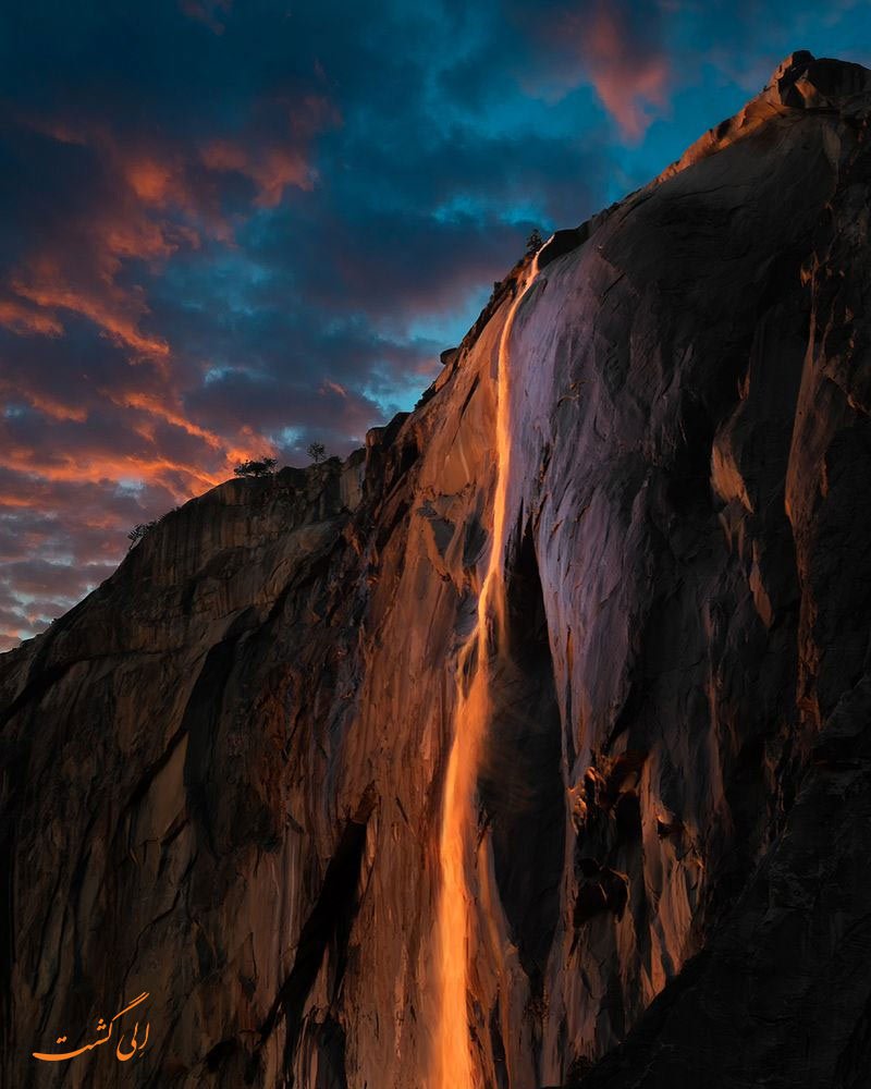 یکی از جذابترین پدیده های طبیعی در پارک ملی یوسمیت کالیفرنیا، آبشار آتشین یوسمیت است. این آبشار که البته رنگ آبی در آن دیده نمی شود به هورستیل فایرفال (The Horsetail Firefall) نیز معروف است.
