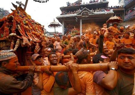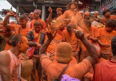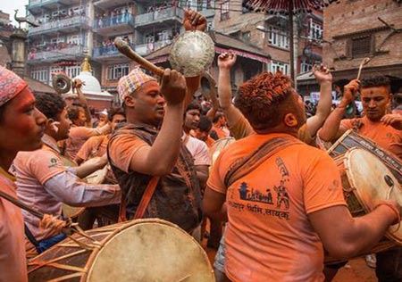 شرکت کنندگان به همدیگر پودری نارنجی می پاشند، عده ای از شرکت کنندگان 30 ارابه شامل تصاویری از الهه ها و رب النوع های گوناگون را دور شهر می چرخانند و برخی دیگر سرود می خوانند و می نوازند. این فستیوال هر ساله هزاران گردشگر را به نپال جذب کرده و صحنه های جالبی از فرهنگ نپال را به تصویر می کشد.