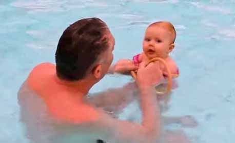 یکی از نوزادانی که به عنوان شاگرد آقای مربی شنا در حال تمرین بود با کمک مربی خود توانست سرپا باایستد ، حالتی و توانایی که یک نوزاد طبیعی بعد از 9 ماهگی به ان می رسد