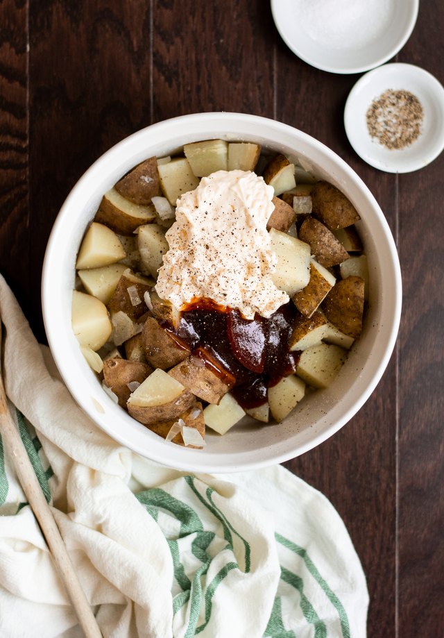 ۱ پیمانه آب ۵ عدد سیب زمینی بزرگ خرد شده به شکل مکعبی نصف یک عدد پیاز خرد شده ۵ عدد تخم مرغ ۱ پیمانه سس مایونز ¼ پیمانه سس باربیکیو نمک و فلفل