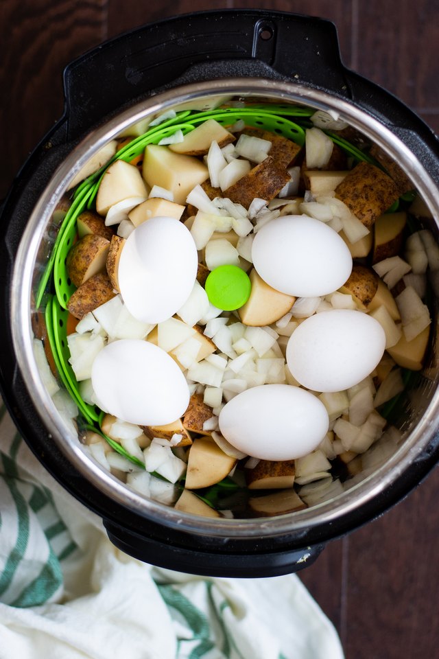 آب را داخل زودپز بریزید و سبد بخارپز را داخل آن قرار دهید. سیب زمینی ها و پیازهای خرد شده را اضافه کنید و تخم مرغ ها را روی آن ها قرار دهید. سوپاپ زودپز را ببندید و اجازه دهید مواد به مدت ۵ دقیقه با فشار بالا پخته شود.