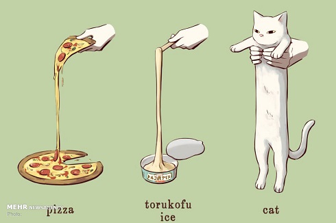 این هنرمند ناشناس به گربه علاقه خاصی دارد گاهی میان کارهای تلخ و گزندهاش شوخ طبعی هم میکند. شاید خیلیها کش آمدن پنیر یک پیتزا را با کش آمدن بستنی ترکی مقایسه کنند اما چه کسی این دو را با یک گربه مقایسه میکند؟ جواب مشخص است.