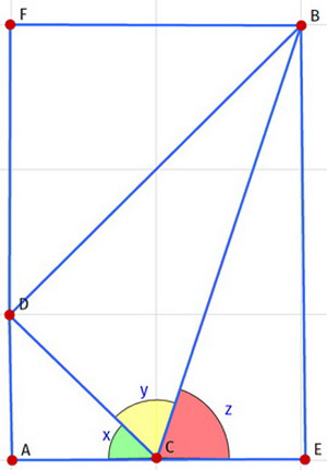 همانطور که در شکل بالا مشخص شده است، مربعی داریم که آنرا به 9 مربع کوچکتر تقسیم می کنیم. در روی این شکل، سه زاویه y، x و z مشخص شده است. آیا می توانید بگویید مجموع این سه زاویه، چند خواهد بود؟