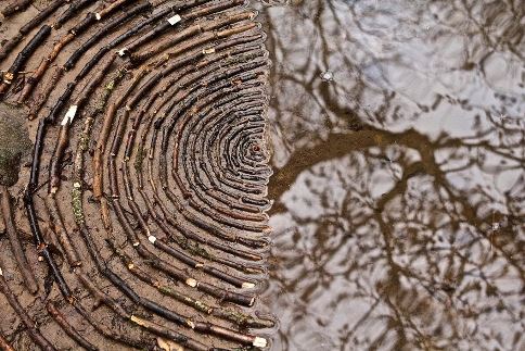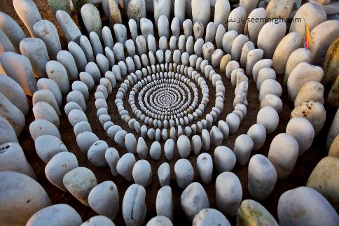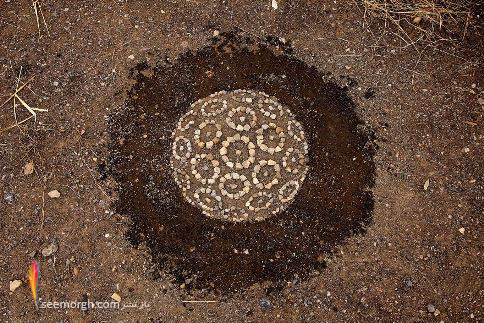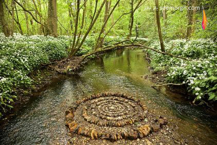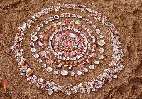 او از سنگ ها، برگ ها، تکه های چوب، میوه درخت کاج، بلوط و کلا هر چیزی که سر راهش می بیند استفاده می کند. او این مصالح طبیعی را به شکل های مختلف مارپیچی، منحنی و ... چیده و آنچه در ذهنش دارد را روی زمین پیاده می کند.