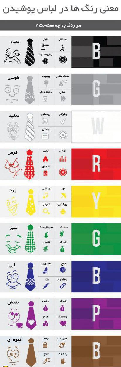 در اینفوگرافیک زیر ما به تفکیک رنگها، اطلاعات مربوط به هر کدام از آنها را در اختیار شما قرار دادهایم تا بدانید رنگ لباس شما چه معنایی دارد و در انتخاب خود دقت بیشتری به خرج دهید.