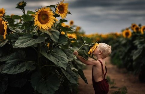 عکس روز نشنال جئوگرافیک مربوط به پسربچه ای است که در یک مزرعه آفتابگردان مشغول بوییدن گلها است.