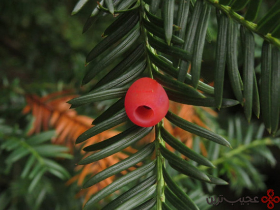گول ظاهر میوههای آبدار سرخدار انگلیسی (English Yew) را نخورید! این گیاه بومی اروپا، آفریقای شمالی و جنوب غربی آسیا، دانههای سمیای دارد که در میوههای سرخ آبدارش پنهان شدهاند. در واقع، میوههای این درخت تنها بخشی از آن هستند که مصرفش برای پرندهها ضرری ندارد. اما فقط ۵۰ گرم از آن برای کشتن انسان کافی است. اول انسان را دچار تشنج و لرزشهای عضلانی میکند و سرانجام باعث ایست قلبی میشود.