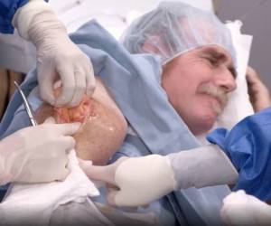 با این وجود خانم دکتر پیمپل پاپر بعد از مدتی کوتاه شروع به خارج نمودن این بافت چربی 30 ساله از بازو آقای چاک نمود و سپس آنرا بخیه زد که در تصاویر می توانید این بافت عظیم 30 ساله را مشاهده نمایید.