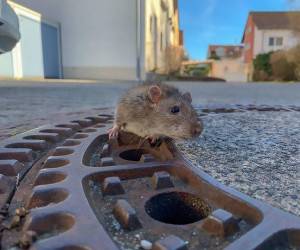گیر کردن موش چاق در در دریچه فاضلاب