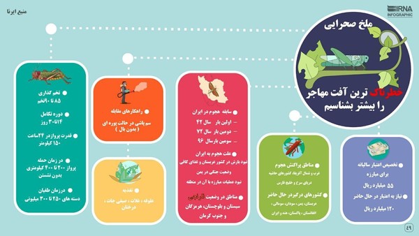 در ادامه اینفوگرافیکی برایتان قابل مشاهده است که با خواندن آن می‌توانید به برخی از ویژگی‌های جالب این دسته از ملخ‌ها و سابقه هجومشان به کشورمان و برخی موضوعات دیگر در این‌باره پی ببرید.