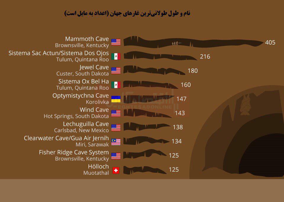 در نمودار ارائه شده، به ترتیب نام و طول طولانیترین غارهای جهان را مشاهده میکنید؛
