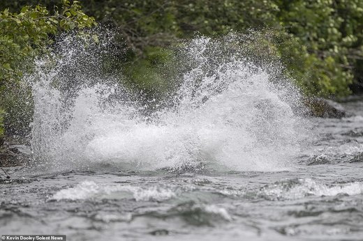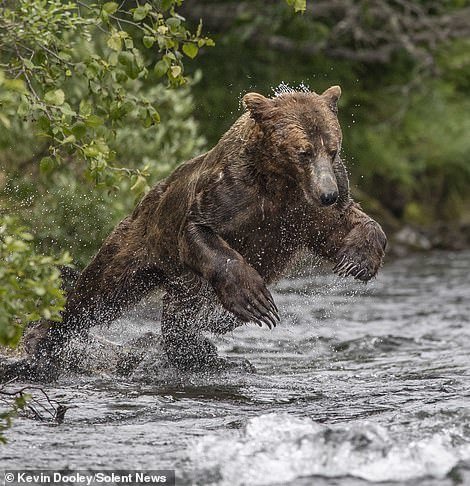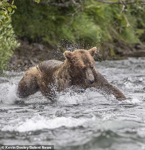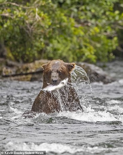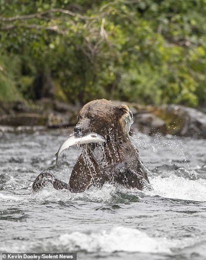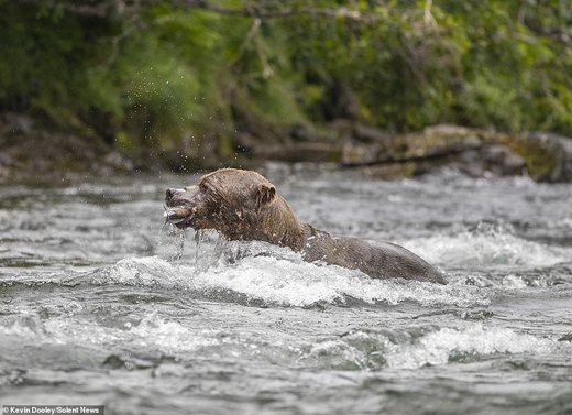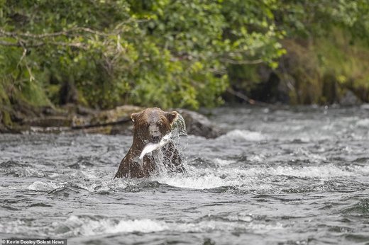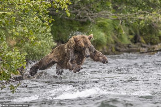 Kevin Dooley، عکاس ۵۷ ساله حیاتوحش به هنگام قایقسواری در رودخانه آلاگناک (Alagnak) واقع در جنوب آلاسکا، صحنهای از یورش یک خرس قهوهای برای شکار ماهی سالمون را عکاسی کرده که در زیر میبینید.