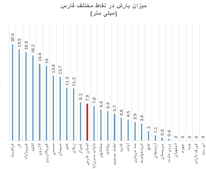 فراشبند با 20.6 میلیمتر بارندگی، لار با 19.5 میلیمتر و فیروزآباد با 18.9 میلیمتر پر بارشترین شهرهای استان فارس بودهاند. در استهبان، جهرم، فسا، فورگ داراب و نیریز نیز تا کنون بارندگی گزارش نشده است.