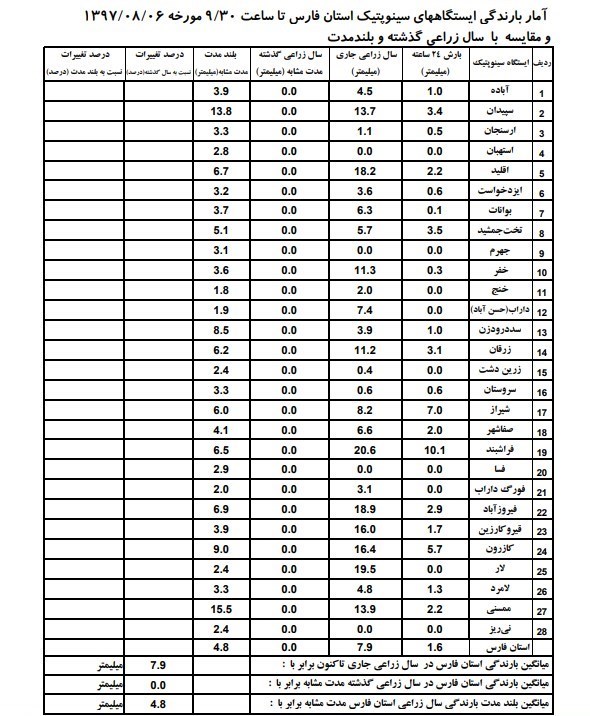 آمار بارندگی ایستگاههای سینوپتیک استان فارس تا ساعت 9:30 دقیقه امروز نشان میدهد که در سال زراعی جاری در مجموع 7.9 میلیمتر باران در استان فارس باریده است.