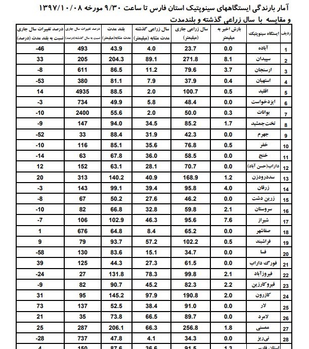 براساس آمار بارندگی ایستگاههای هواشناسی استان فارس از ابتدای سال جاری تا ساعت 9:30 هشتم دیماه 91.5 میلیمتر باران در فارس باریده که در مقایسه با مدت مشابه سال زراعی گذشته (36.6 میلیمتر) 150 درصد و در مقایسه مدت مشابه در بلند مدت (87.6 میلیمتر) 4 درصد افزایش داشته است.