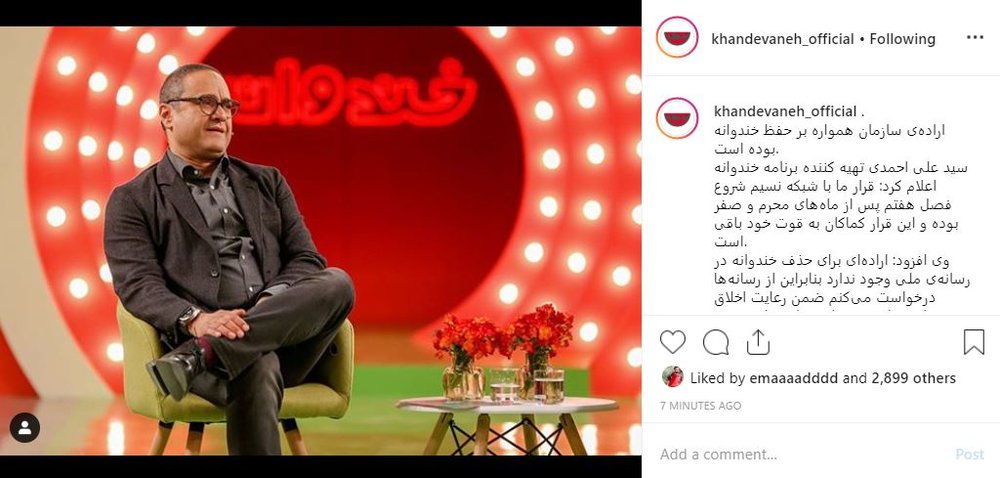 «اراده‌ سازمان همواره بر حفظ خندوانه بوده است. قرار ما با شبکه نسیم، شروع فصل هفتم پس از ماه‌های محرم و صفر بوده و این قرار کماکان به قوت خود باقی‌ است. اراده‌ای برای حذف خندوانه در رسانه‌ ملی وجود ندارد. بنابراین از رسانه‌ها درخواست می‌کنم ضمن رعایت اخلاق حرفه‌ای به این خبر خلاف واقع دامن نزنند.