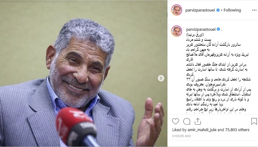 ۲۶ مرداد، سالگرد آزادی اسیران جنگ تحمیلی و آغاز بازگشت آنان به میهن است. پرویز پرستویی، به همین مناسبت، با انتشار پستی، صفحه اینستاگرام خود را بهروز کرد.