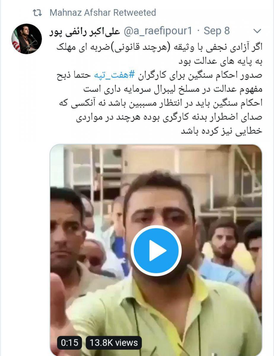 مهناز افشار از آلمان، پست رائفی‌پور درباره‌ کارگران هفت تپه را ریتوییت کرد
