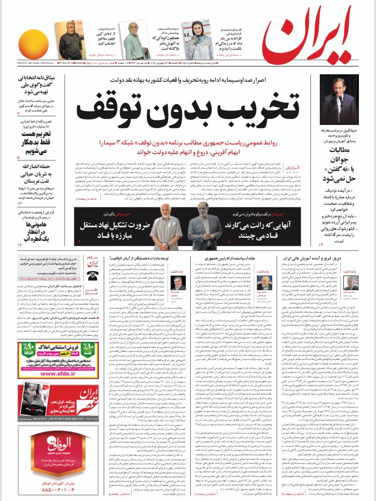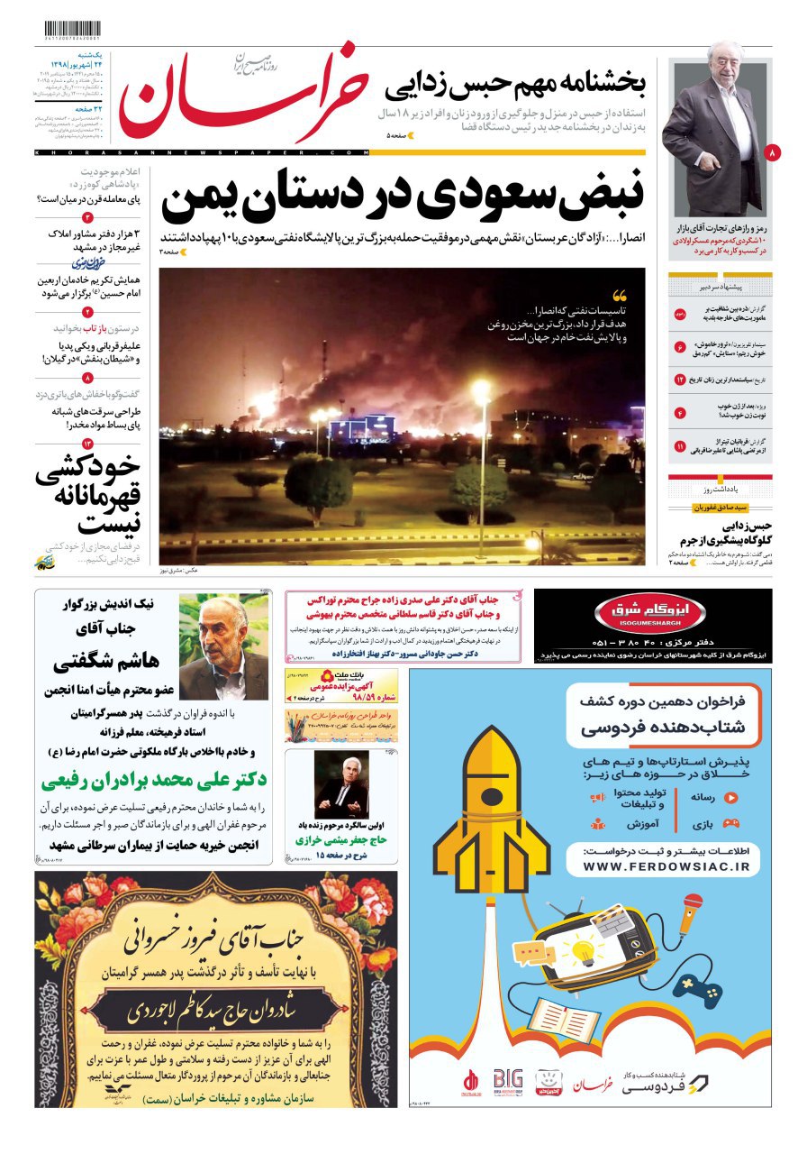 حمله پهپادی حوثیهای یمن به پالایشگاههای نفتی آرامکو عربستان و نیز اختلافات دولت و صداوسیما، تیتر و عکس بسیاری از مطبوعات امروز چاپ تهران را به خود اختصاص داد.