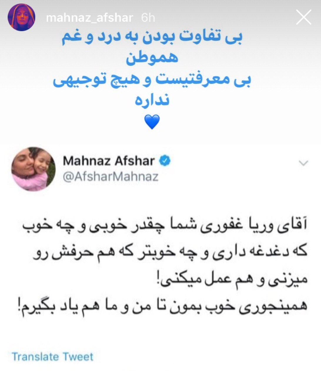 پست حمایتی مهناز افشار برای وریا غفوری