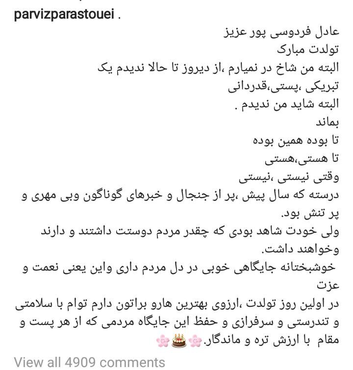 پرویز پرستویی به مناسبت چهل و پنجمین سالروز تولد عادل فردوسیپور پیام تبریکی را در پست اینستاگرام خود منتشر کرد و ضمن گلایه از بی مهریهای نوشت:
