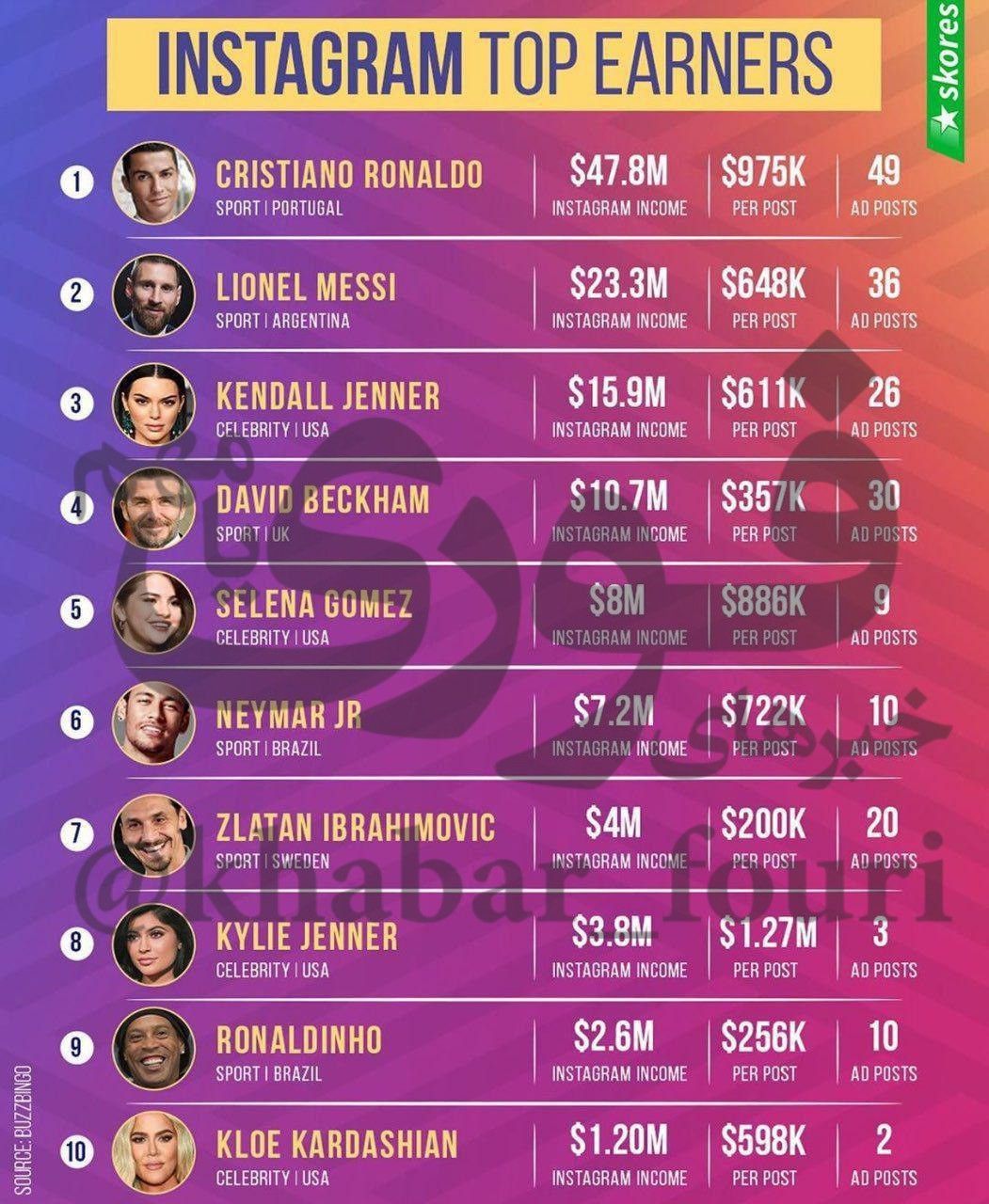 رونالدو در حالی‌ در صدر این فهرست قرار دارد که درآمد او از اینستاگرام با ۴۸ میلیون دلار، از درآمد سالیانه‌ش در یوونتوس با ۳۴ میلیون دلار بیشتر است!