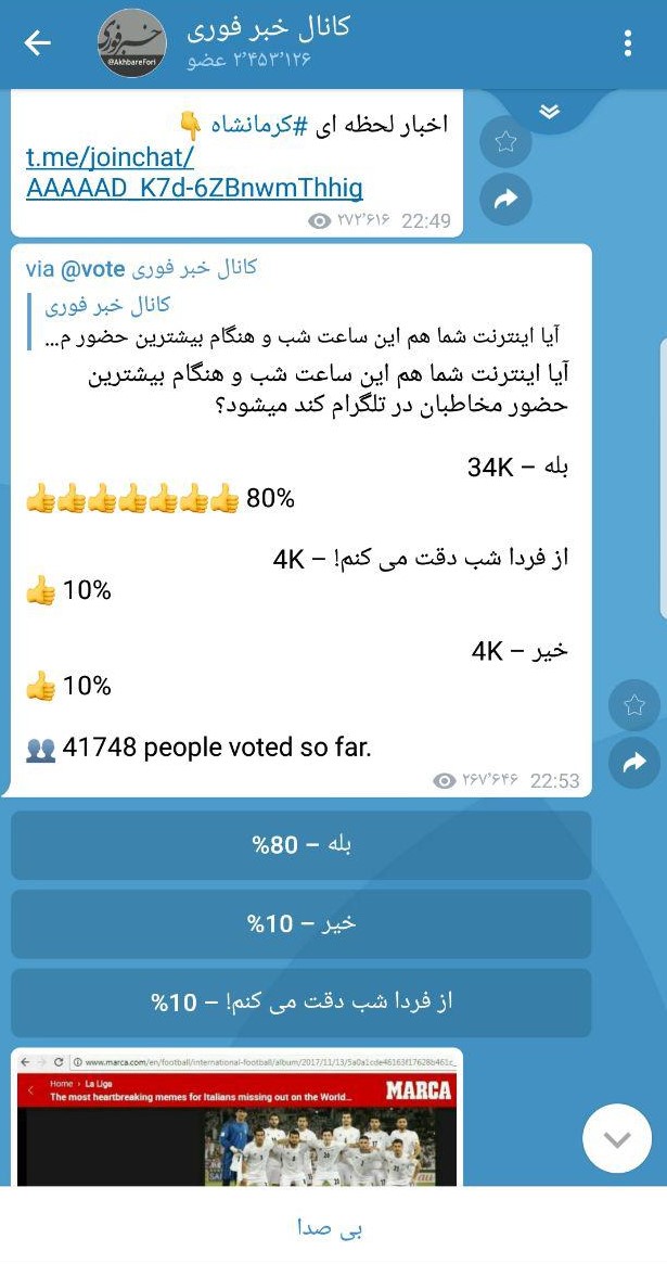 در همین رابطه 83 درصد از کاربران و مخاطبان بزرگترین کانال تلگرام گفته اند که از برنامه های پیام رسان ایرانی استفاده نمی کنند.