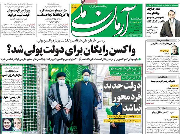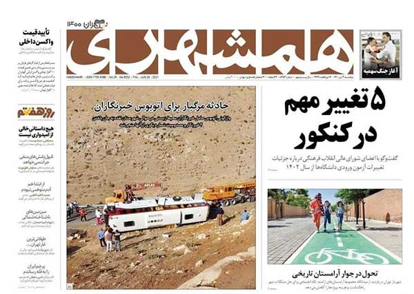 واژگونی اتوبوس خبرنگاران، دلایل مشارکت ۴۸ درصدی در انتخابات و پولی شدن واکسن برکت، عمده ترین تیترهای صفحه نخست روزنامه های صبح امروز پنج شنبه ۳ تیر را تشکیل دادند.