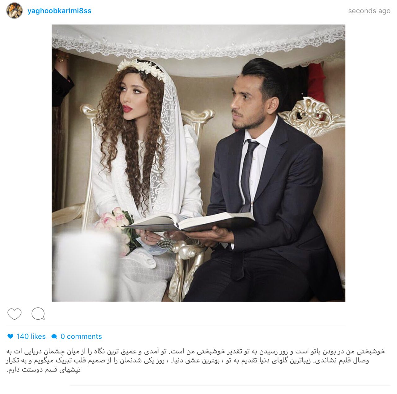 يعقوب كريمى بازيكن سابق استقلال در اینستاگرام خود از ازدواجش با نيكى محرابى بازيگر تلويزيون خبر داد.