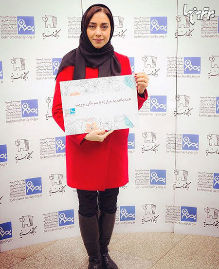 عکسی از بهاره کیان افشار در حاشیه جشن خیریه منتشر شده است که متنی در دسته وی نوشته شده است: همه با هم به مبارزه با سرطان برویم.