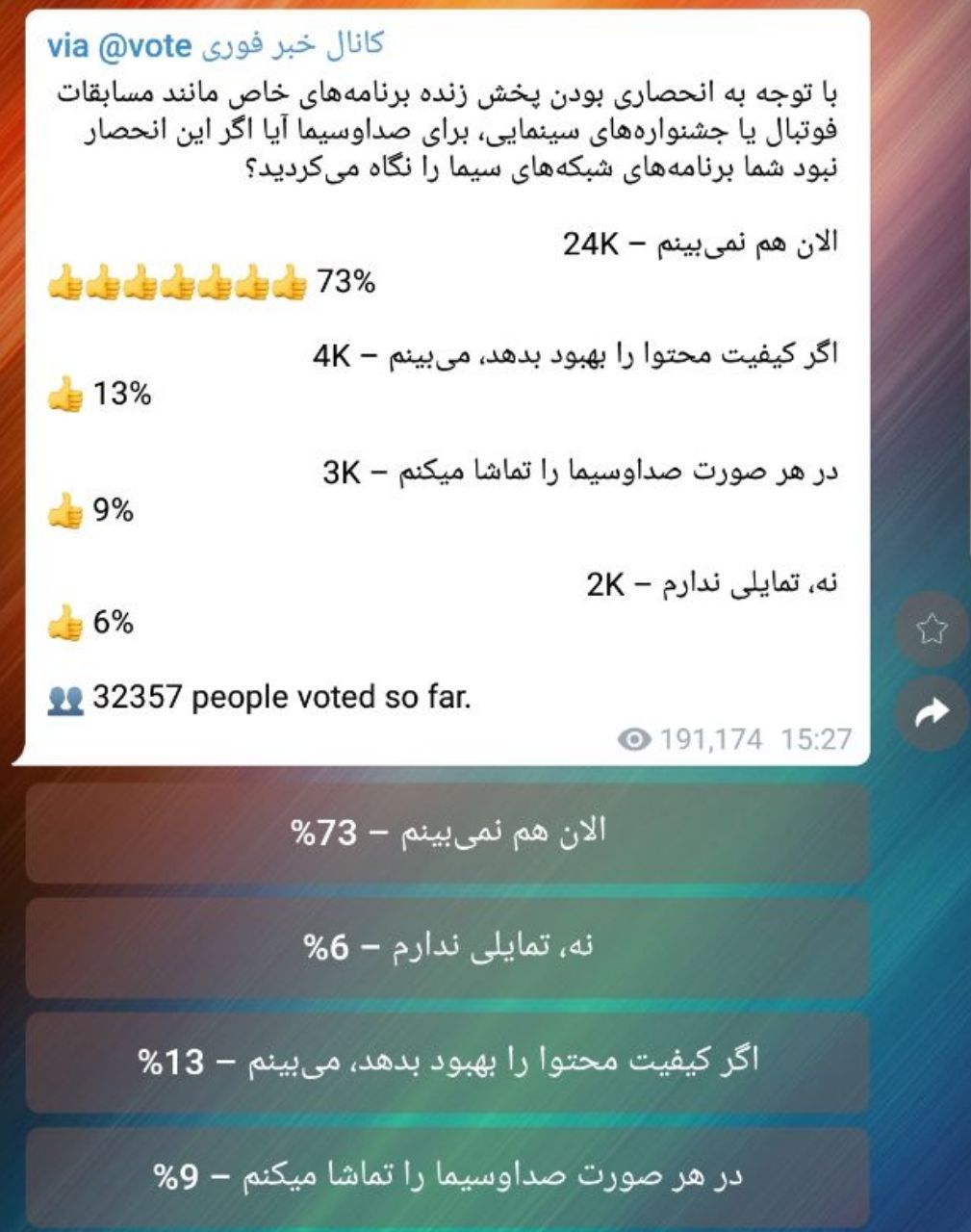 در پاسخ به این سوال، 73درصد از بیش از 32هزار نفری که در این نظرسنجی شرکت کرده اند، گفته‌اند که در هیچ حالتی حتی با وجود رانت برنامه‌سازی، برنامه‌های رسانه ملی را تماشا نمی‌کنند.