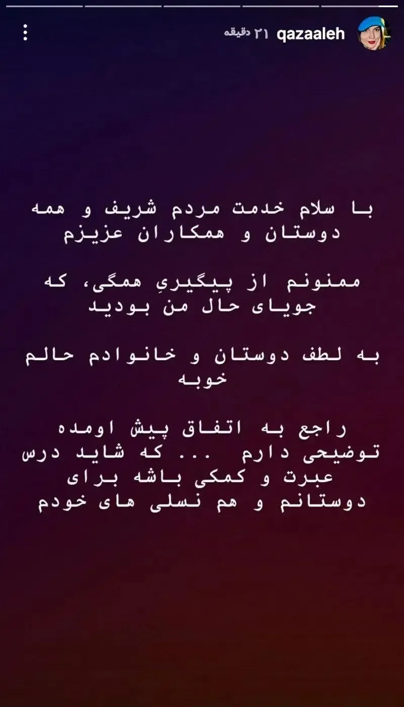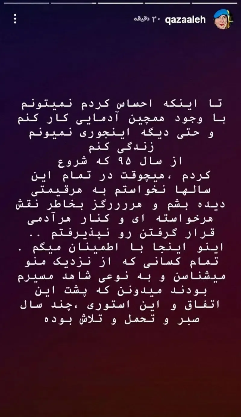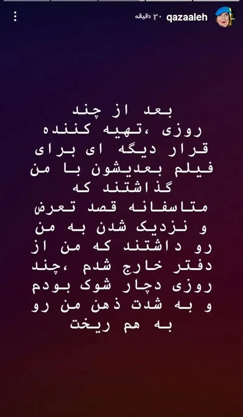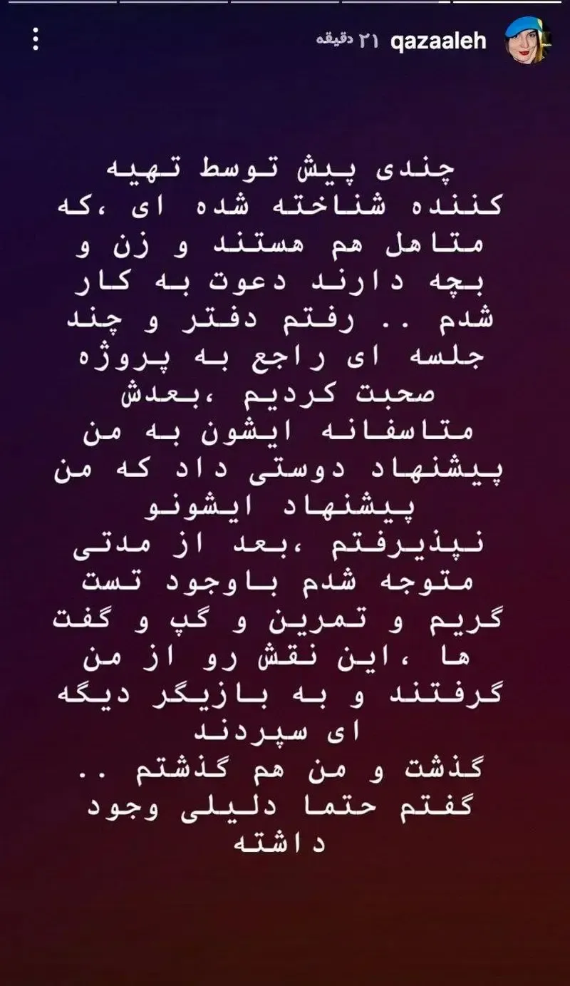برای اطلاع از ادامه گفتهها و جزئیات این تجربه تلخ، رشته استوریهای غزاله اکریم را که در صفحه اینستاگرامی اش منتشر کرد در ادامه بخوانید: