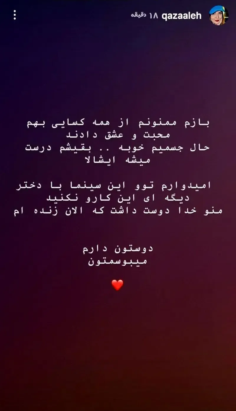 به گزارش فرارو، این بازیگر مدتی بود که با انتشار استوریهای ناراحتکننده و تلخ در صفحه شخصی خود، حال و احوال ناخوشایندش را با مخاطبانش به اشتراک میگذاشت. حتی تصویری از خود منتشر کرد و نوشت: «شاید این عکس آخر باشد»، که بازتاب گستردهای در میان مردم و هنرمندان داشت و نگرانیهای زیادی ایجاد کرد.