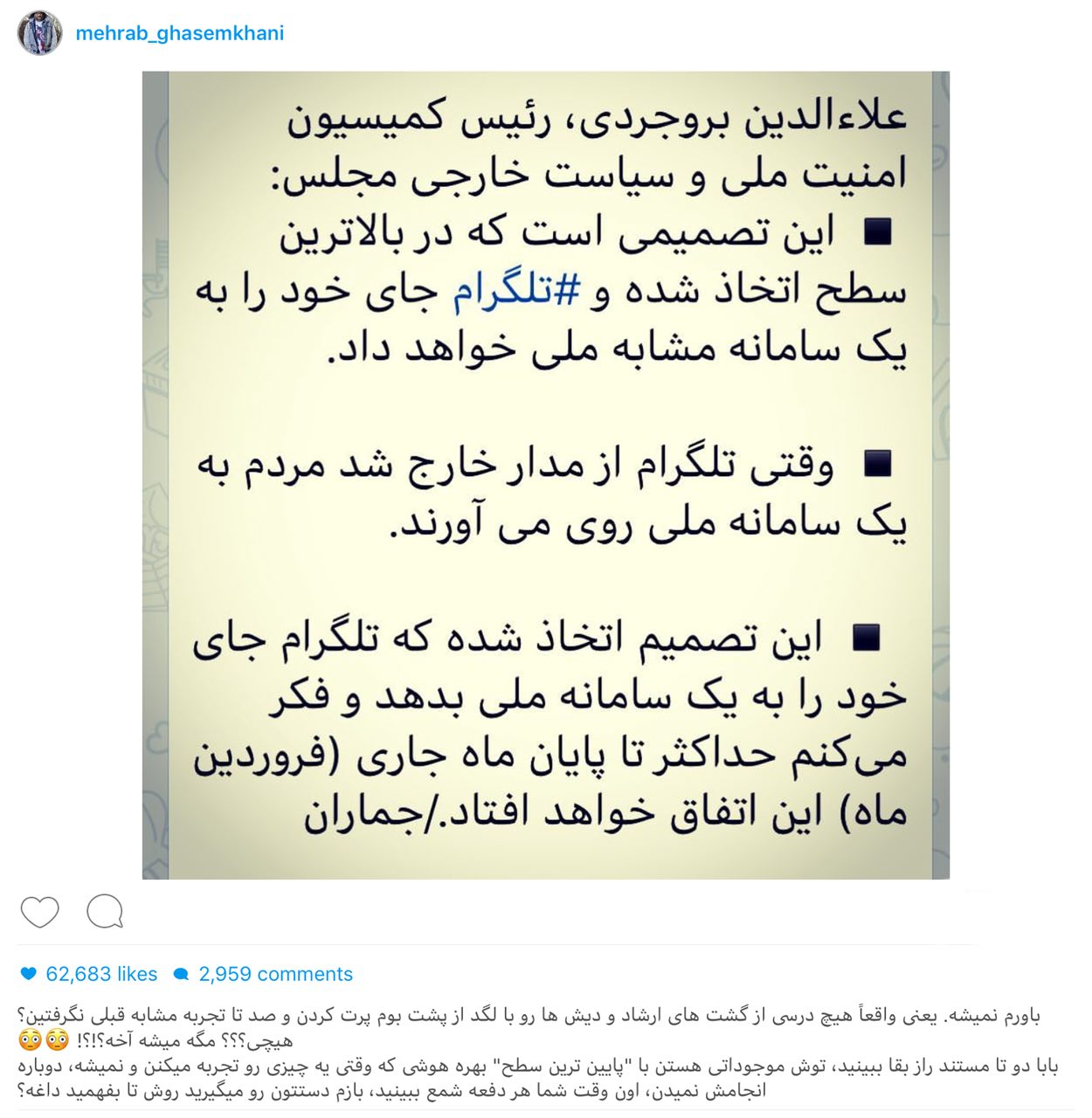 واكنش اينستاگرامى تند مهراب قاسمخانى به فيلترينگ تلگرام