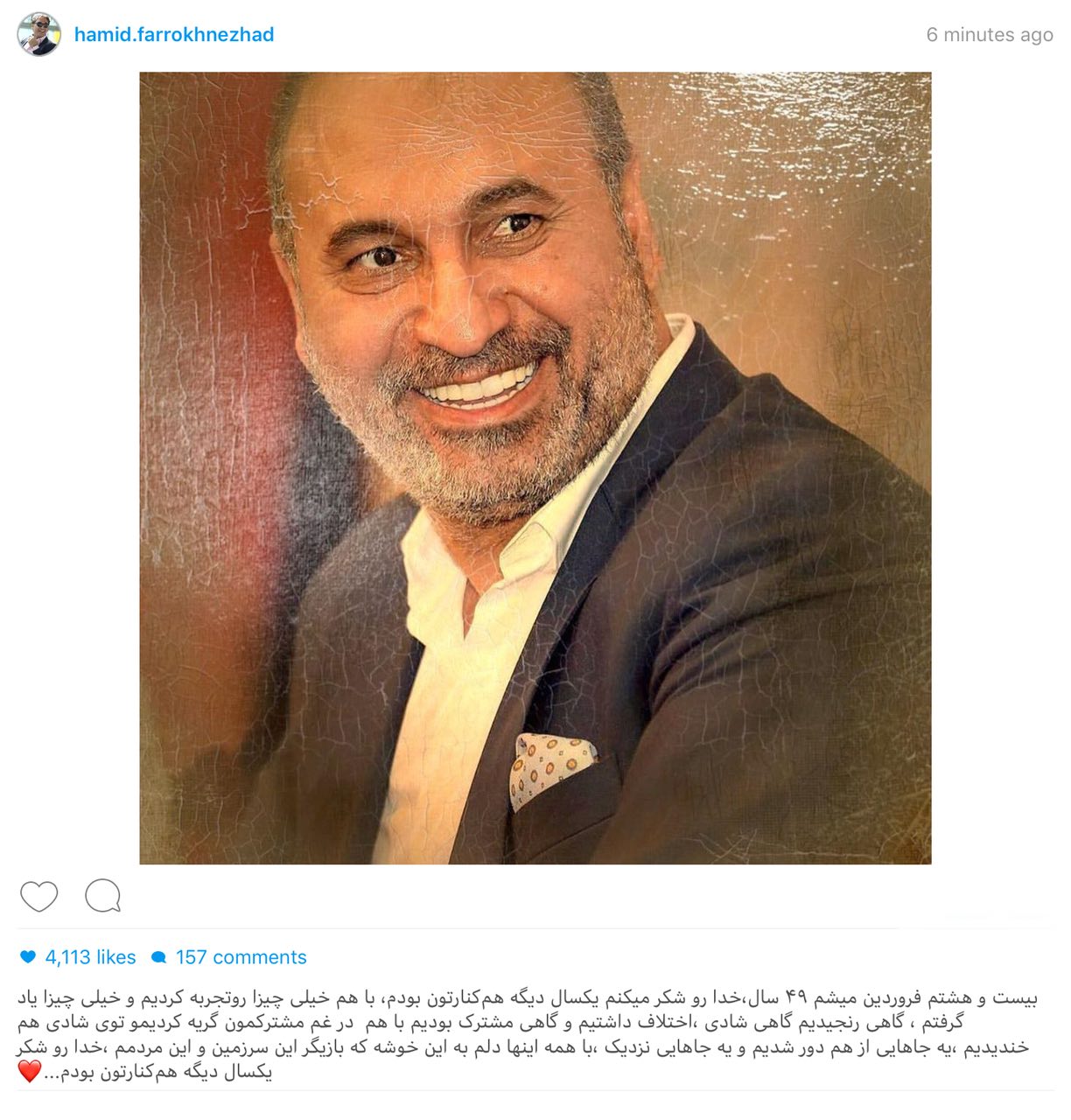 حميد فرخ نژاد در آستانه سالروز تولد ٤٩سالگى اش در اینستاگرام پستی را ارسال کرد.