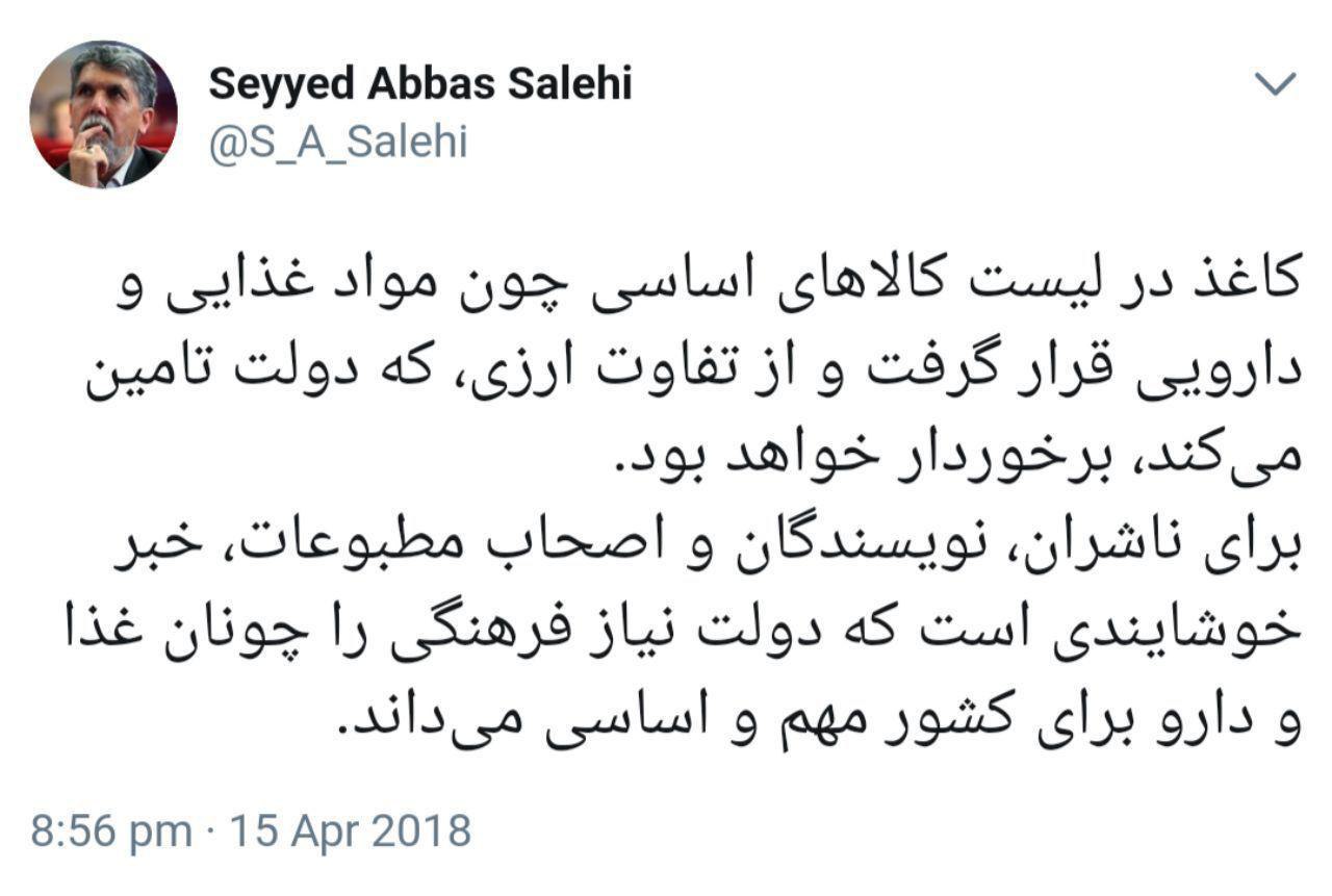 سیدعباس صالحی در صفحه شخصی توئیت خود نوشته است: «کاغذ در لیست کالاهای اساسی چون مواد غذایی و دارویی قرار گرفت و از تفاوت ارزی که دولت تامین می‌کند، برخوردار خواهد بود».