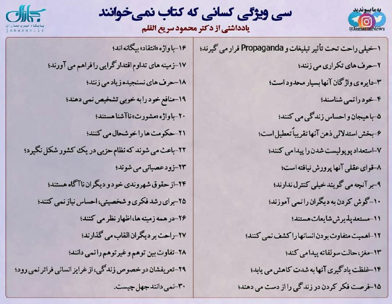 خبرفوری فرهنگی کتاب و ادبیات ۱۰ اردیبهشت ۱۳۹۷ ۰۹:۰۸ 30ویژگی کسانی که کتاب نمیخوانند دکتر محمود سریع القلم در یادداشتی 30ویژگی کسانی که کتاب نمیخوانند را برشمرده است. کپی شد کدخبر: 361100 ت ت 35 کتاب دکتر سریع القلم کپی شد با دوستان خود به اشتراک بگذارید: