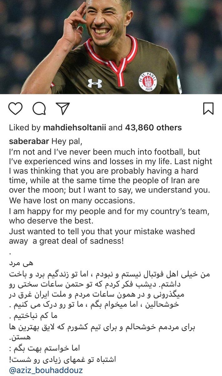 صابر ابر، بازیگر تئاتر، سینما و تلویزیون یادداشتی در صفحه شخصی خود به دو زبان انگلیسی و فارسی خطاب به مدافع مراکشی منتشر کرد.