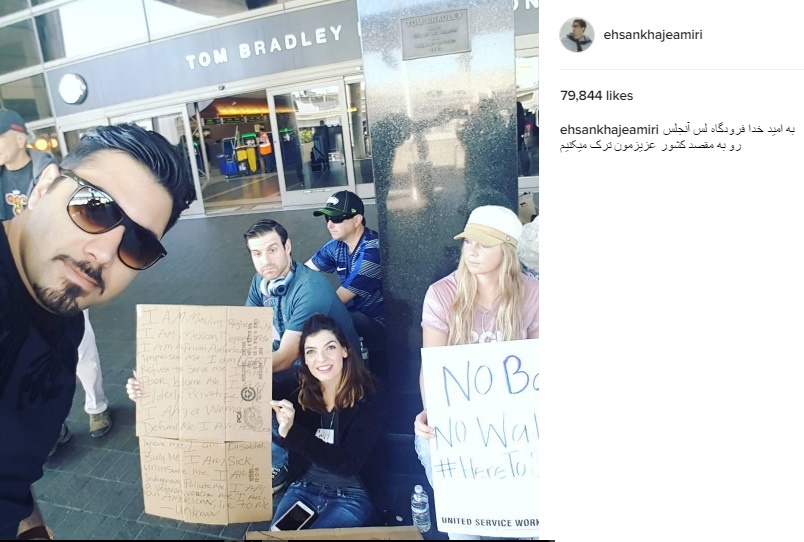 در این میان احسان خواجهامیری نیز از فرصت استفاده کرده و پیش از ترک خاک آمریکا با چند تن از این معترضان سلفی گرفته است. او این عکس را در اینستاگرام خود به اشتراک گذاشت.