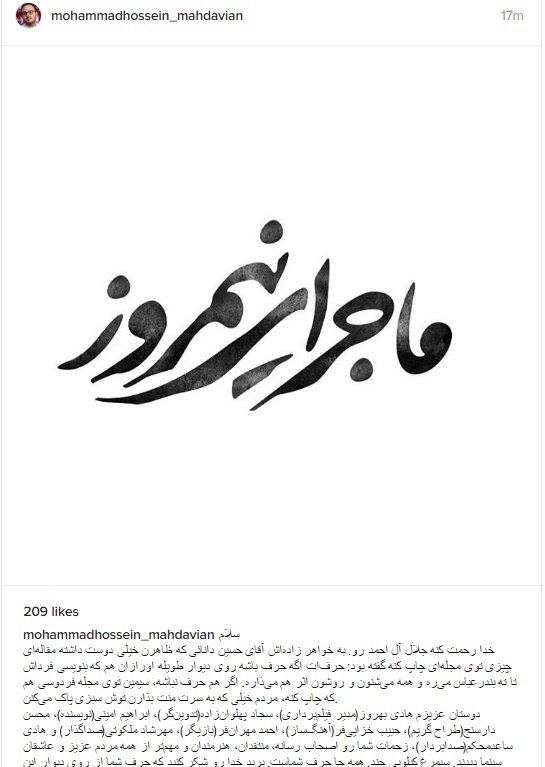 به گزارش خبرگزاری خبرآنلاین، این کارگردان که سال گذشته با فیلم «ایستاده در غبار» در جشنواره فجر حضور داشت، در این باره در اینستاگرام نوشت: «خدا رحمت کنه جلال آل احمد رو. به خواهر زادهاش آقای حسین دانائی که ظاهرن خیلی دوست داشته مقالهای چیزی توی مجلهای چاپ کنه گفته بود: حرفات اگه حرف باشه روی دیوار طویله اورازان هم که بنویسی فرداش تا ته بندرعباس میره و همه میشنون و روشون اثر هم میذاره. اگر هم حرف نباشه، سیمین توی مجله فردوسی هم که چاپ کنه، مردم خیلی که به سرت منت بذارن توش سبزی پاک میکنن.