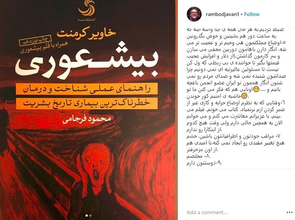 رامبد جوان در اینستاگرام خواندن کتاب «بیشعوری» را پیشنهاد کرد و کنار آن درباره اوضاع و اتفاقات این روزهای کشور اظهارنظر کرد. جوان نوشت: «خشم و ناامیدی هیچ تغییر مفیدی ایجاد نمیکند.»