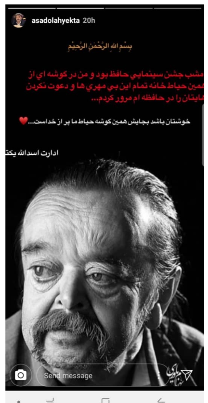 اسدالله یکتا با انتشار یک استوری از دعوت نشدنش به جشن حافظ گله کرد.