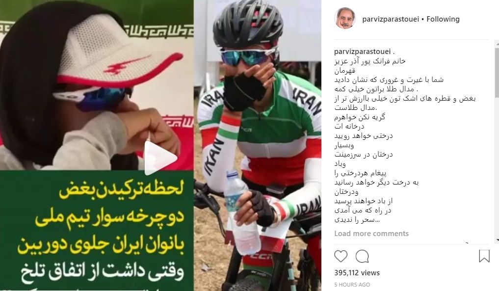 پرویز پرستویی برای فرانک پورآذر دوچرخه سوار تیم ملی ایران در مسابقات آسیایی جاکارتا در اینستاگرام نوشت: «خانم فرانک پورآذر عزیز، قهرمان، شما با غیرت و غروری که نشان دادید، مدال طلا براتون خیلی کمه، بغض و قطرههای اشک تون خیلی باارزشتر از مدال طلاست.