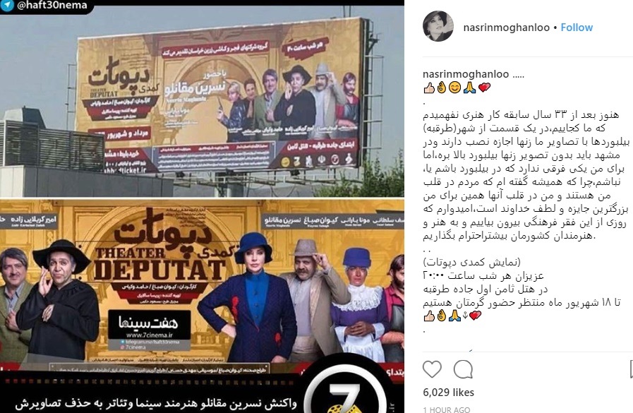 او با انتشار تصویر بیلبوردهای تبلیغاتی این نمایش در طرقبه و مشهد، این چنین به مقایسه آنها پرداخت: «هنوز بعد از ۳۳ سال سابقه کار هنری نفهمیدم که ما کجاییم، در یک قسمت از شهر (طرقبه) بیلبوردها با تصاویر ما زنها اجازه نصب دارند و در مشهد باید بدون تصویر زنها بیلبورد بالا بره.
